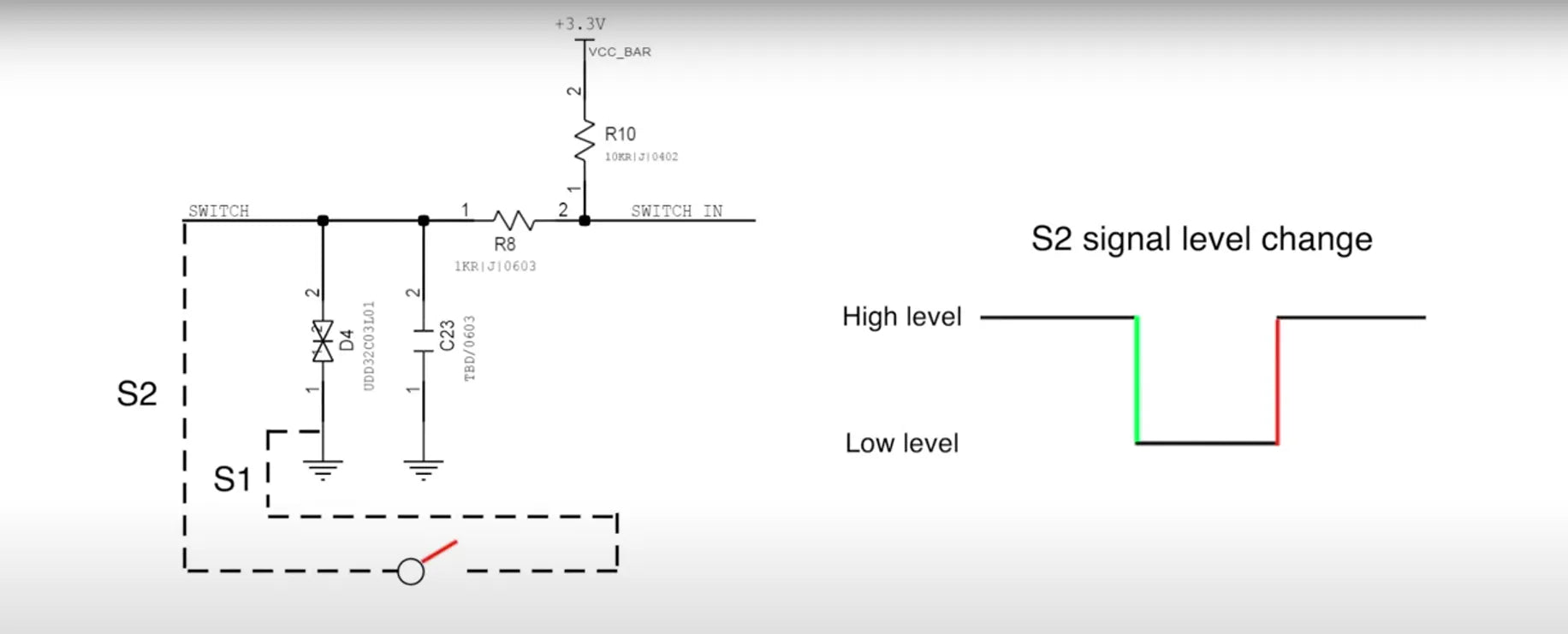 In the MINI circuit, the S1 is at signal ground level while the S2 is hanging with a pull-up resistor at 3.3V level. The change of the external switch state triggers the S2 signal level change. when S1 and S2 are disconnected (external switch state is open), the S2 signal level is still kept as 3.3V high level signal, the connection of S1 and S2 would lead S2 signal level into “ground” low. Here is a table to indicate the relationship of external switch state vs signal level.