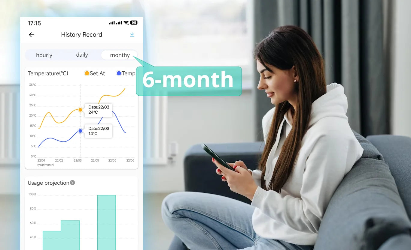 【Umfassende Funktionen】 Die Kindersicherung verhindert versehentliche Änderungen durch Kinder. Der Frostschutz verhindert das Einfrieren und Platzen von Rohren. Unterstützt 6 Monate historische Daten, sodass Sie Heizpläne basierend auf Nutzungstrends optimieren können.