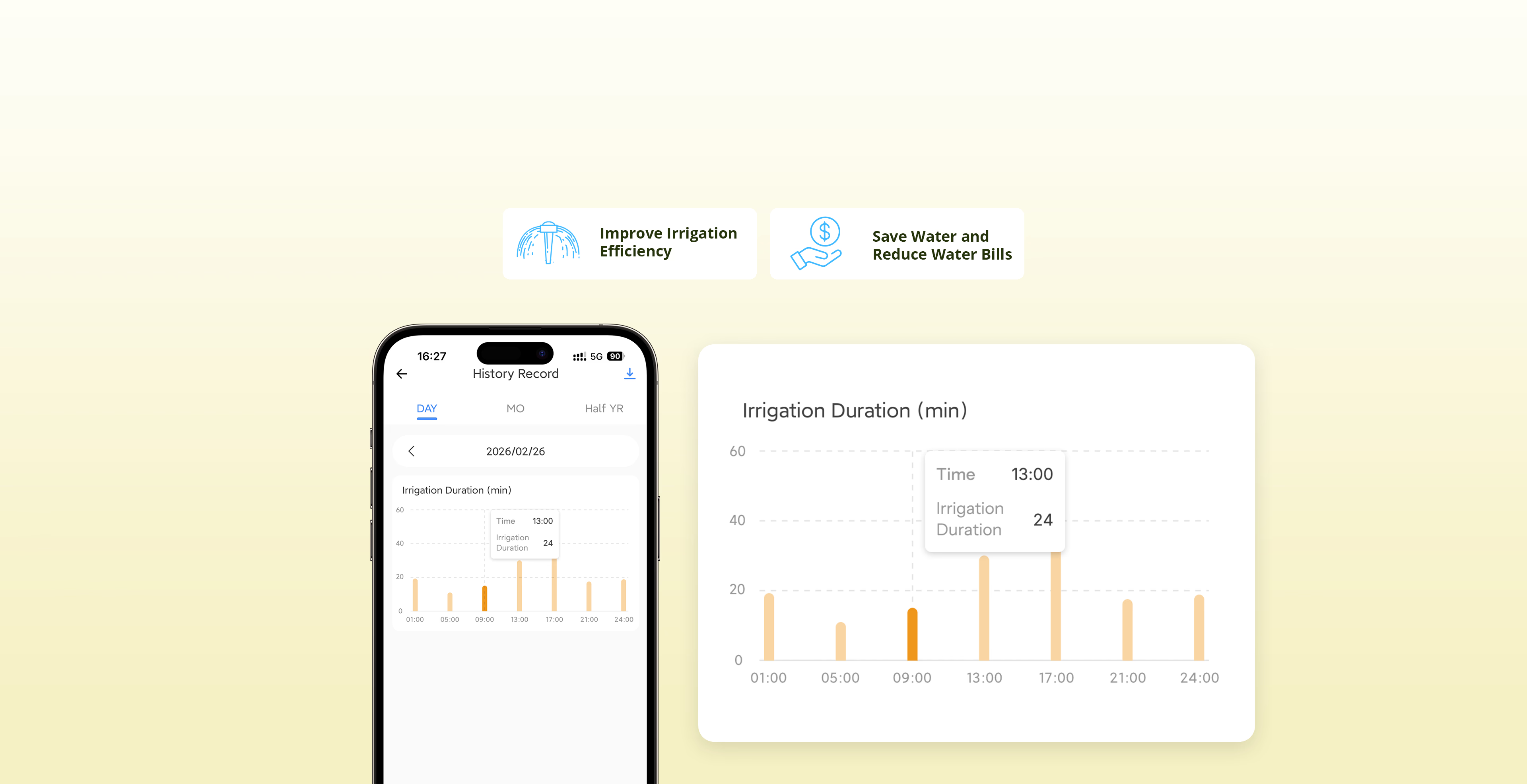 View watering history by day, month, or half-year. Quickly spot abnormal irrigation, export records, and manage watering like a pro.
