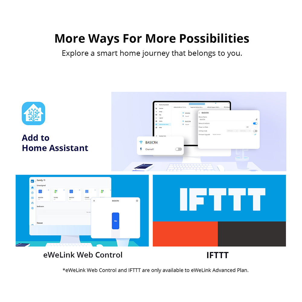 【Built-in eWeLink-Remote Gateway – Unlock Local Two-Way Control】As a gateway device for eWeLink-Remote, BASICR4 lets you pair with S-Mate2, R5, and other remote sub-devices. Set up two-way or multi-way control, and enjoy low-latency local control without relying on Wi-Fi.