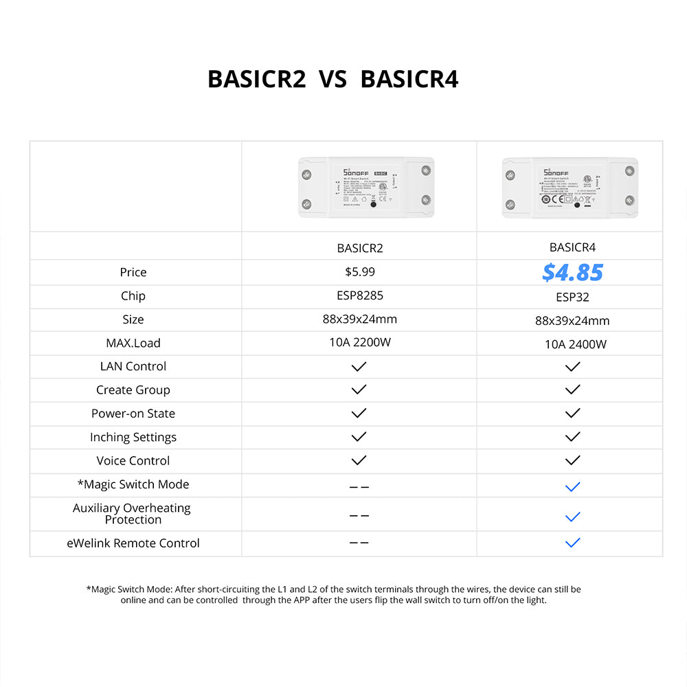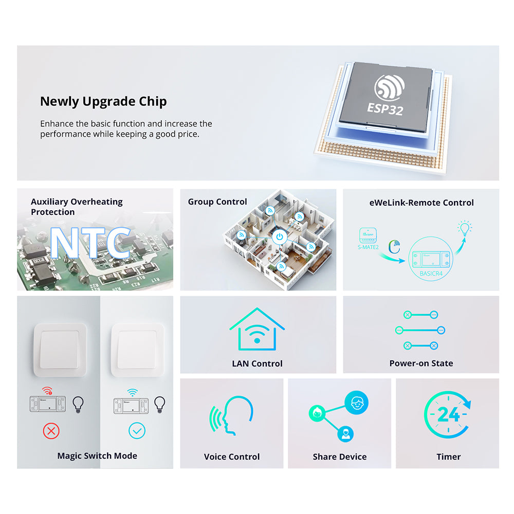 SONOFF BASICR4 is an affordable Wi-Fi smart switch powered by the advanced ESP32 chip for faster, more stable performance. With Magic Switch Mode, control devices via app even if the wall switch is off. Acts as an eWeLink-Remote gateway for local two-way control with sub-devices like S-MATE2. Includes thermal protection for safety. Ideal for smart home beginners upgrading lights, fans, or appliances.