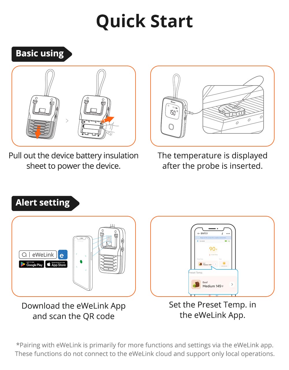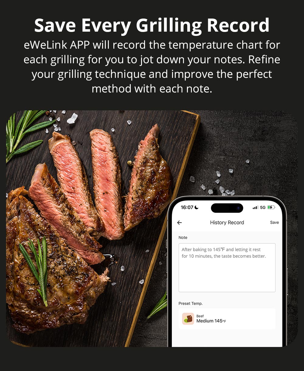 【Remote Monitoring】Monitor your grill from anywhere. The SONOFF BBQ Meat Thermometer transmits real-time temperature data to your phone via the eWeLink app, so you can keep an eye on your food without hovering over the grill.