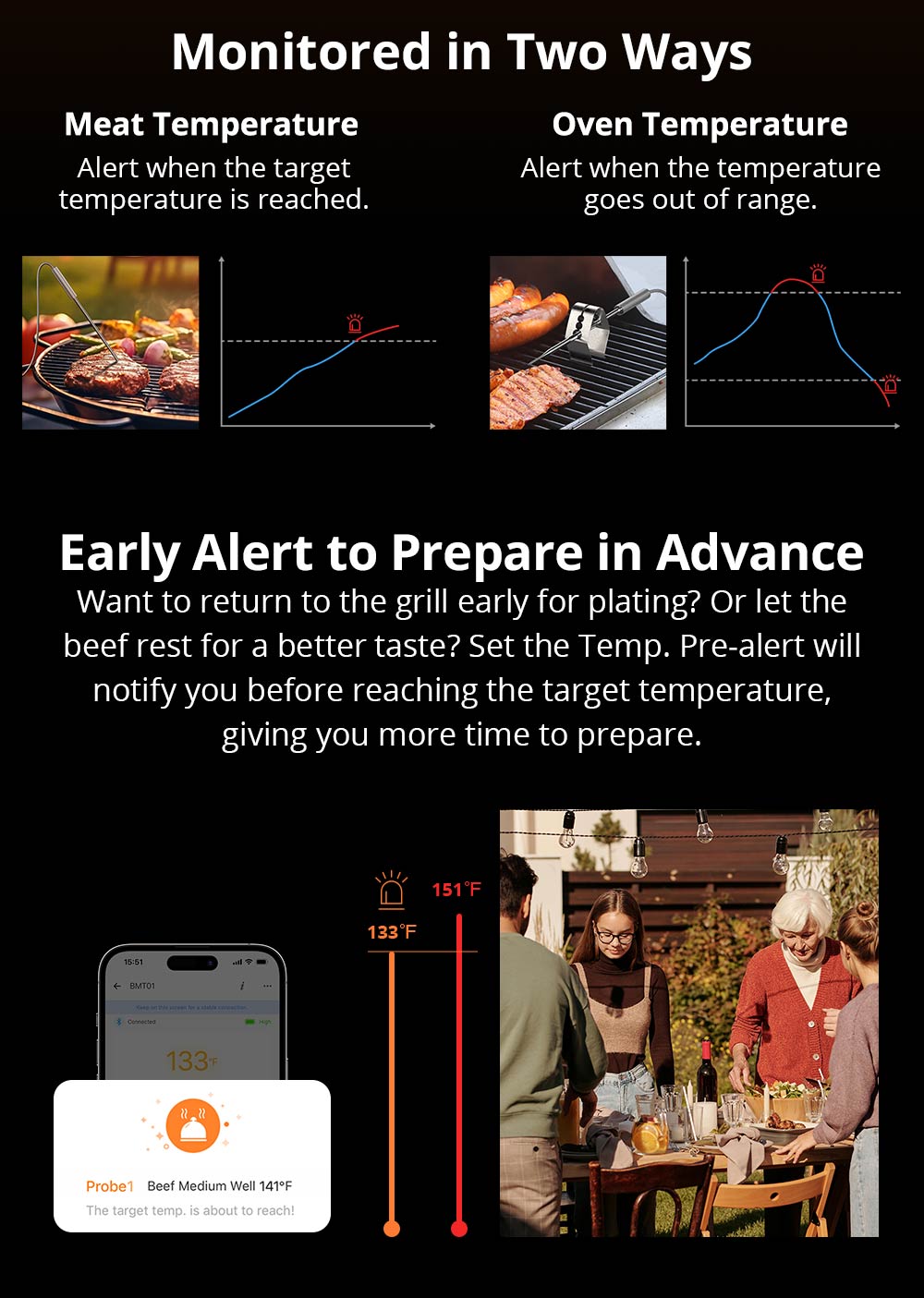【Temperature Alerts】Set your desired target temperature for any type of meat. Once the temperature is reached, both the thermometer and your phone will alert you—helping prevent overcooking or burning.