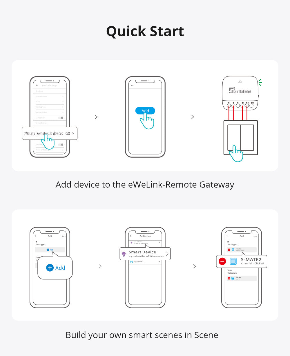 【50M Reliable Local Control with “eWeLink-Remote”】Pair S-Mate2 with MINIR4 or other eWeLink-Remote gateway-enabled devices to enable up to 50 meters of stable local wireless control (no obstacles). No Wi-Fi required for communication—ideal for multi-room smart control.