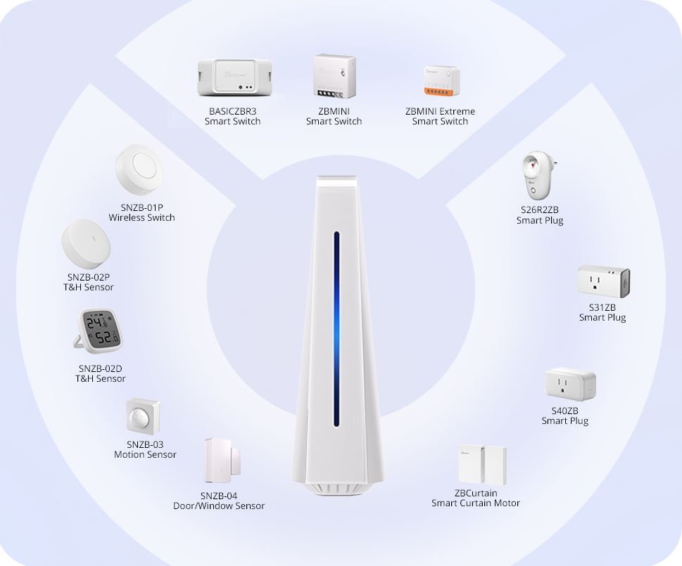 【Broad Compatibility】Fully compatible with Zigbee protocol devices and Wi-Fi LAN devices. Supports up to 128 Zigbee sub-devices, and can extend coverage using Zigbee routers. Integrates SONOFF LAN-compatible Wi-Fi devices via the eWeLink Smart Home add-on.