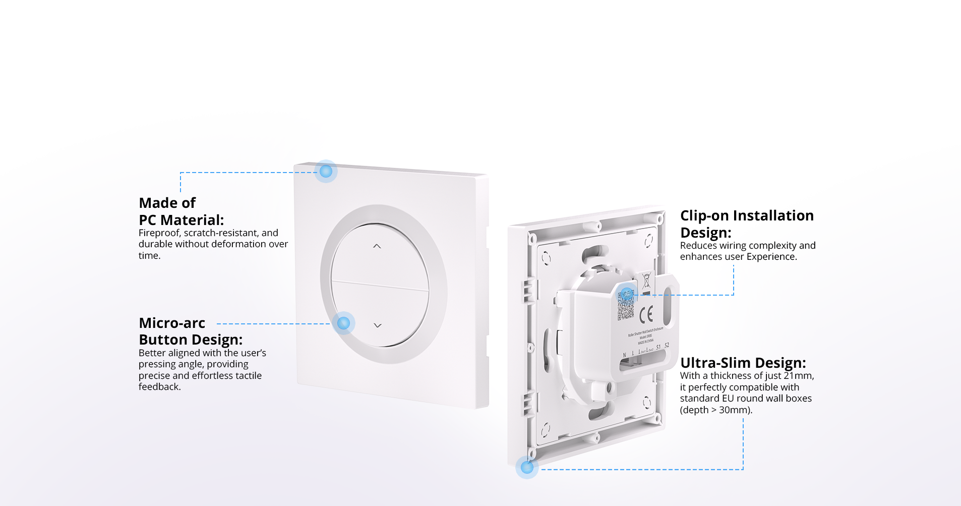 La carcasa del interruptor de pared para persiana enrollable (ERBS) es un accesorio diseñado para MINI-RBS, fabricado con material PC de alta calidad. ERBS es ignífugo, resistente a los arañazos y duradero sin deformarse con el tiempo. Su diseño de instalación con clip simplifica el cableado y mejora la experiencia del usuario. El diseño del botón de microarco se alinea con el ángulo natural de presión, ofreciendo una retroalimentación táctil precisa y sin esfuerzo. Con un perfil ultradelgado de 21 mm, encaja perfectamente en cajas de pared redondas estándar de la UE, combinando funcionalidad con una apariencia elegante y moderna.