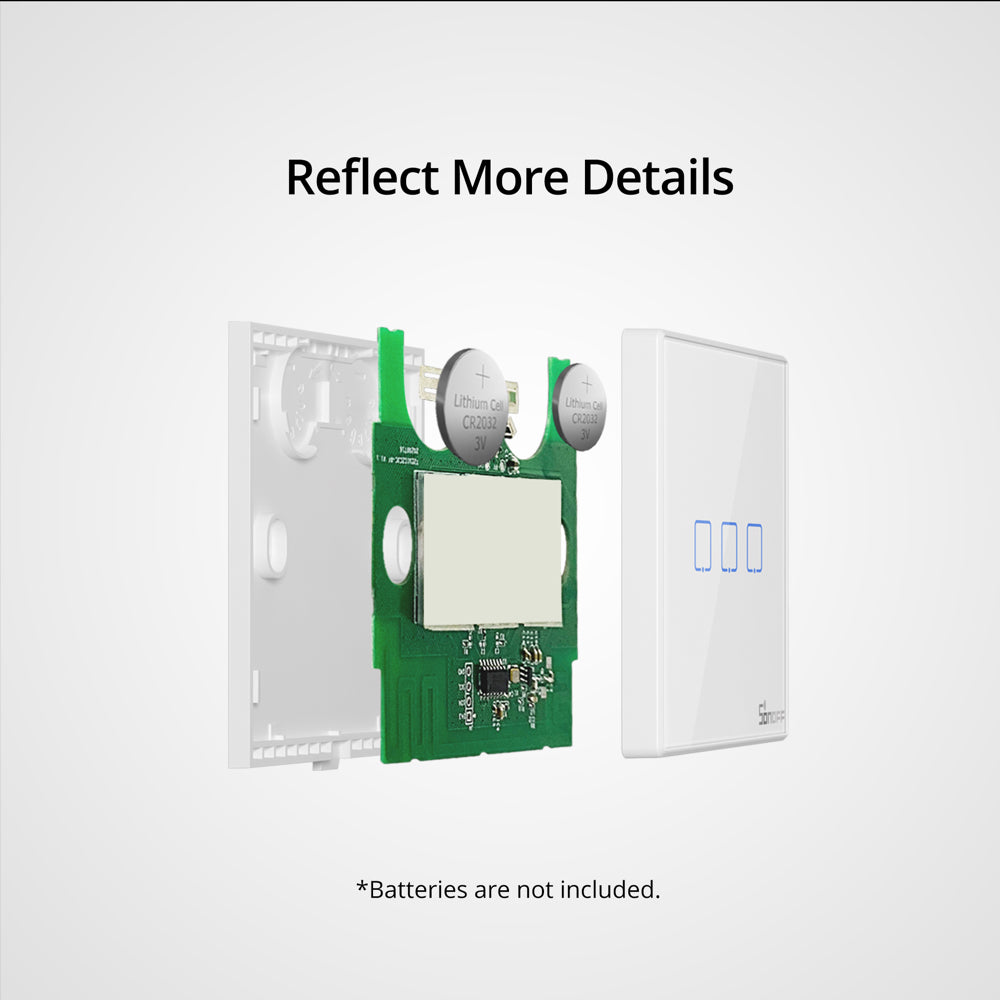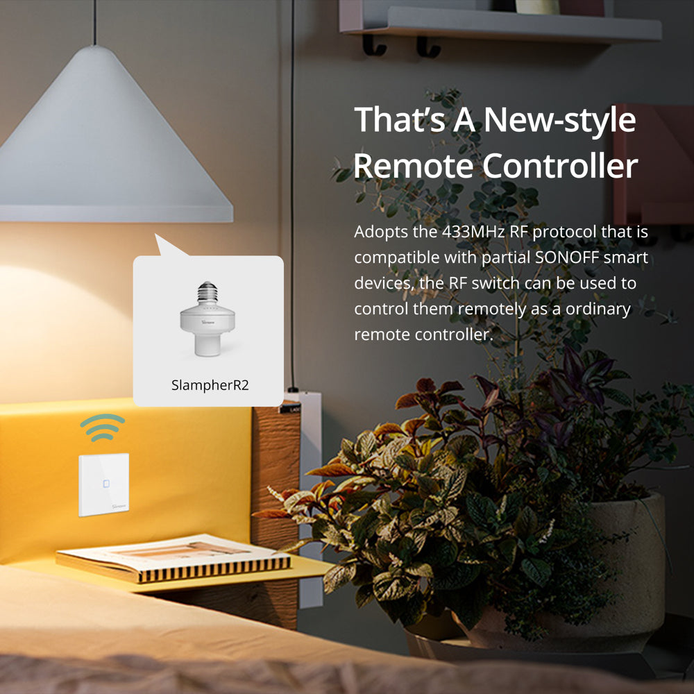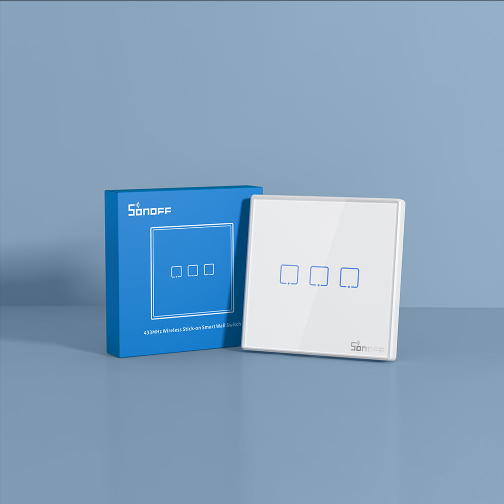 El panel de pared SONOFF T2EU-RF con control remoto RF presenta un elegante panel de vidrio con botones táctiles y retroiluminación LED ajustable. Disponible en opciones de 1/2/3 módulos. No se necesita cableado: solo pégalo y empareja con dispositivos RF de 433MHz. Funciona con batería (no incluida).
