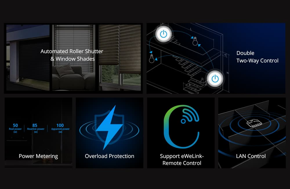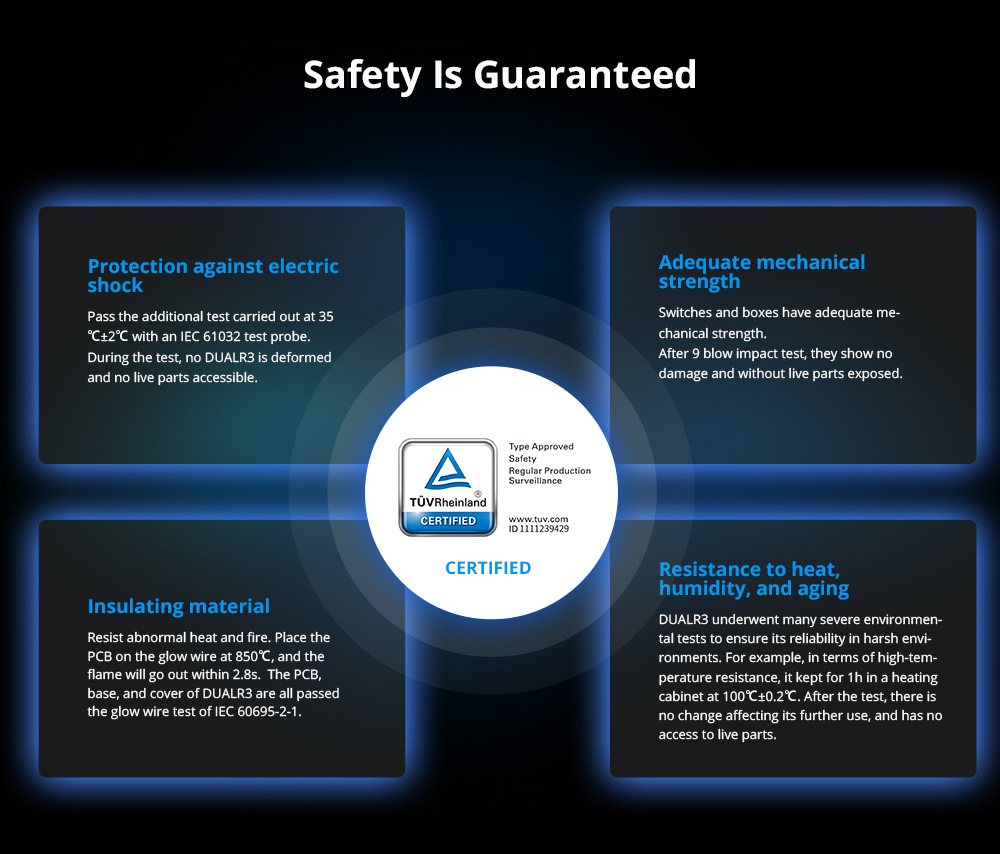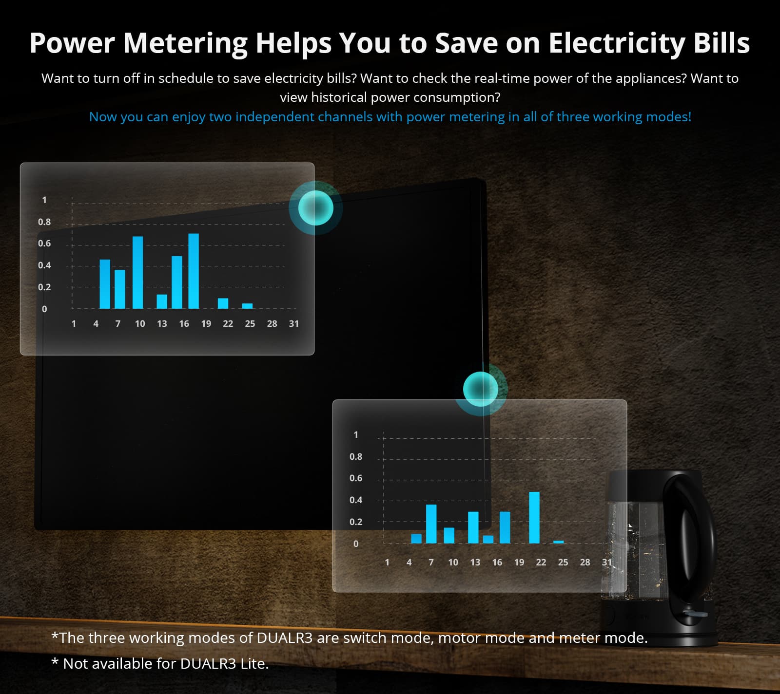 SONOFF DUALR3/DUALR3 Lite è un interruttore intelligente a doppio canale progettato per un'automazione domestica flessibile. Usa la Modalità Motore per controllare in modo intelligente tende o persiane motorizzate, oppure la Modalità Interruttore per gestire indipendentemente due apparecchi. DUALR3 offre anche la misurazione in tempo reale del consumo energetico per canale, aiutando a monitorare l'uso dell'energia; compatibile con vari interruttori da parete (ad esempio, a bilanciere, momentanei, SPDT). Certificato secondo gli standard TÜV, CE, FCC e RoHS per una maggiore sicurezza e affidabilità.
