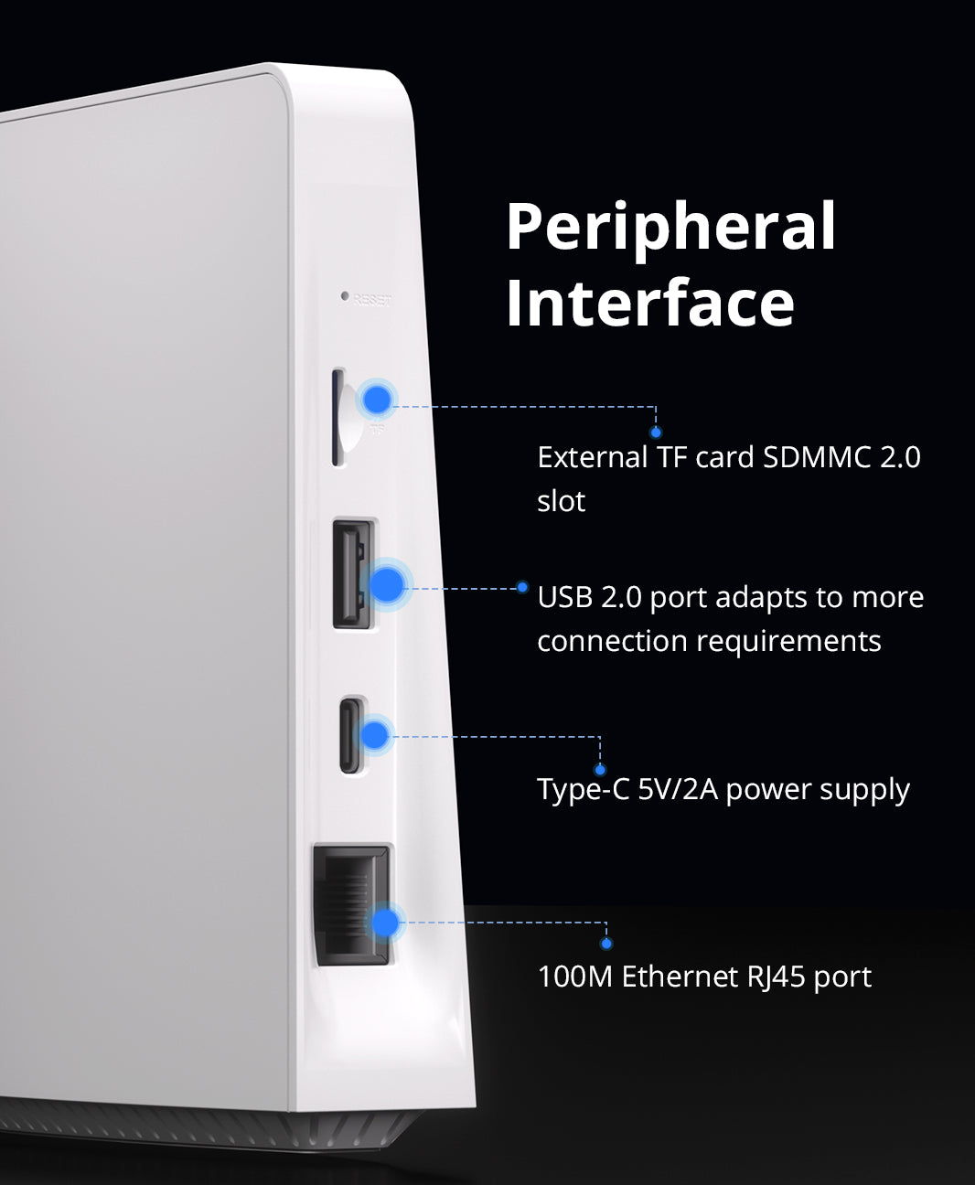 Abbiamo riservato l'interfaccia USB 2.0 per il successivo collegamento a dispositivi di archiviazione mobile e accessori esterni. Nelle versioni future, la porta USB supporterà dispositivi di archiviazione mobile esterni per memorizzare contenuti audio e video e per il backup/esportazione dei dati di archiviazione locale. Inoltre, verranno lanciati successivamente vari accessori esterni per espandere le capacità di iHost, come moduli esterni di ricezione e trasmissione IR per realizzare la funzionalità di telecomando a infrarossi; dongle Thread esterni per consentire l'accesso a dispositivi Thread e Thread-matter, ecc.