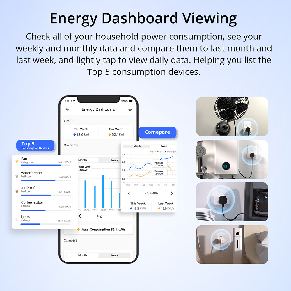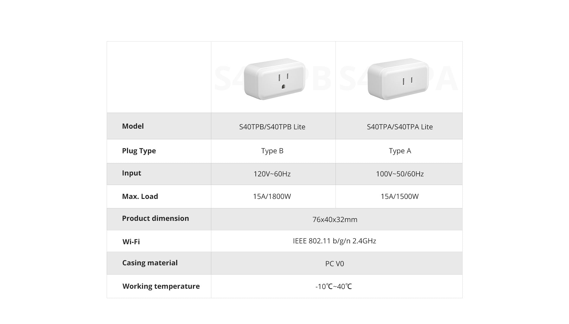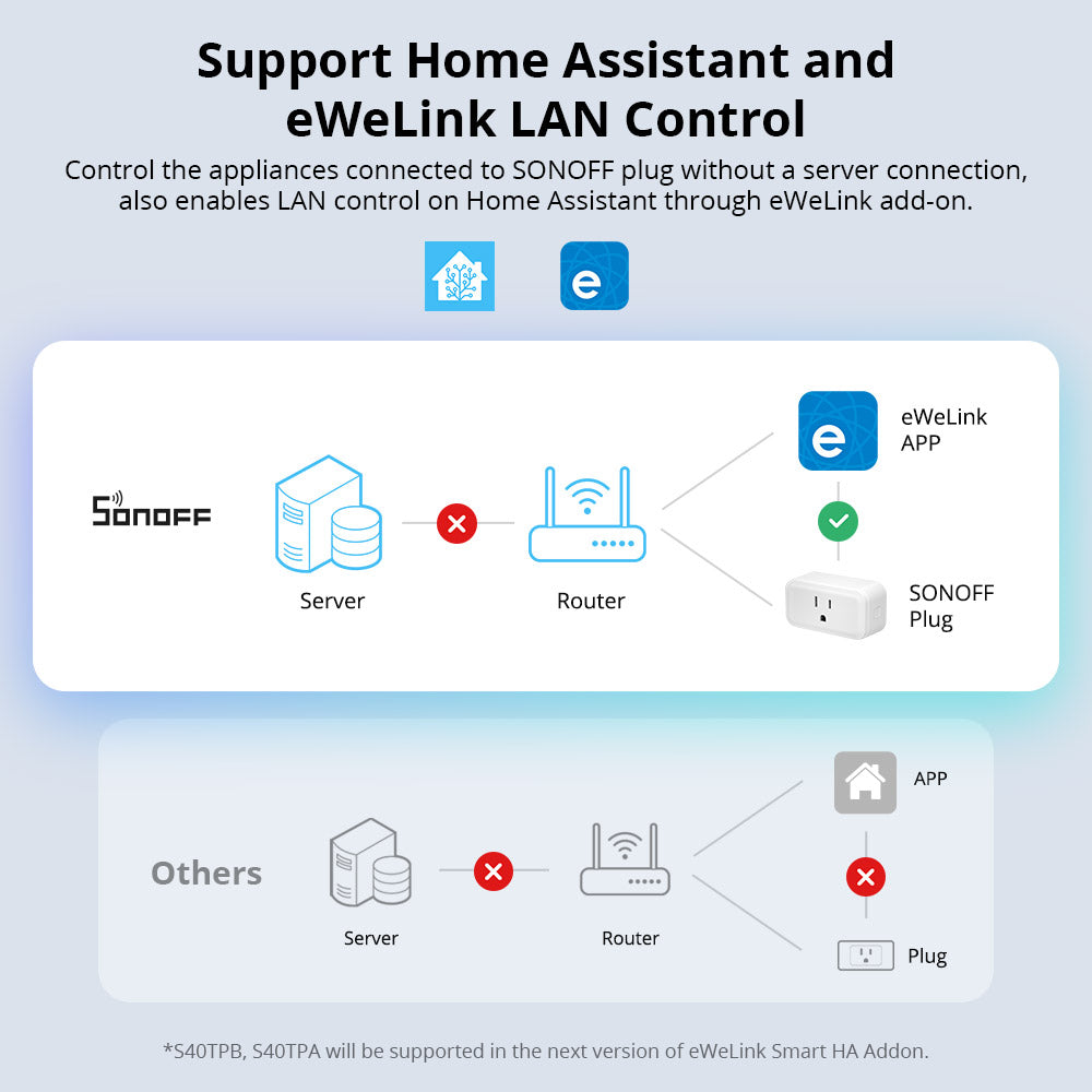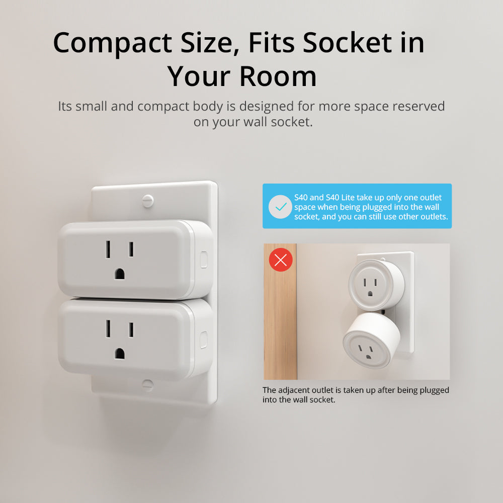 SONOFF S40/S40 Lite è una presa intelligente Wi-Fi compatta con controllo vocale tramite Alexa, Google Home. Gestisci i dispositivi da remoto con l'app eWeLink, imposta orari e monitora il consumo energetico tramite il cruscotto energetico Alexa. Supporta anche il controllo LAN su Home Assistant tramite il componente aggiuntivo eWeLink. Certificato ETL e FCC, garantisce un funzionamento sicuro e affidabile con protezione da sovraccarico e materiali ignifughi, il tutto in un design salvaspazio.