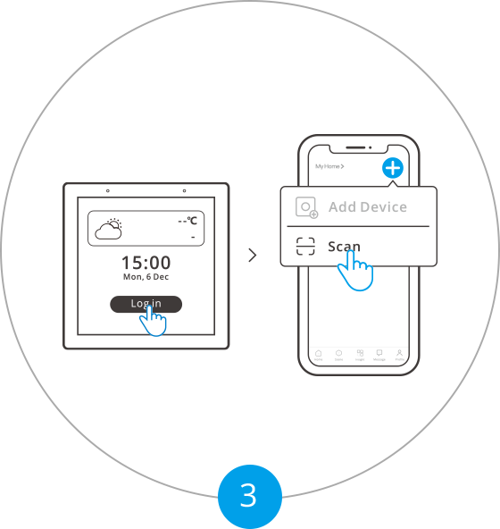 Tocca "Accedi" sul dispositivo e tocca "+" sull'App eWeLink per selezionare "Scansiona".