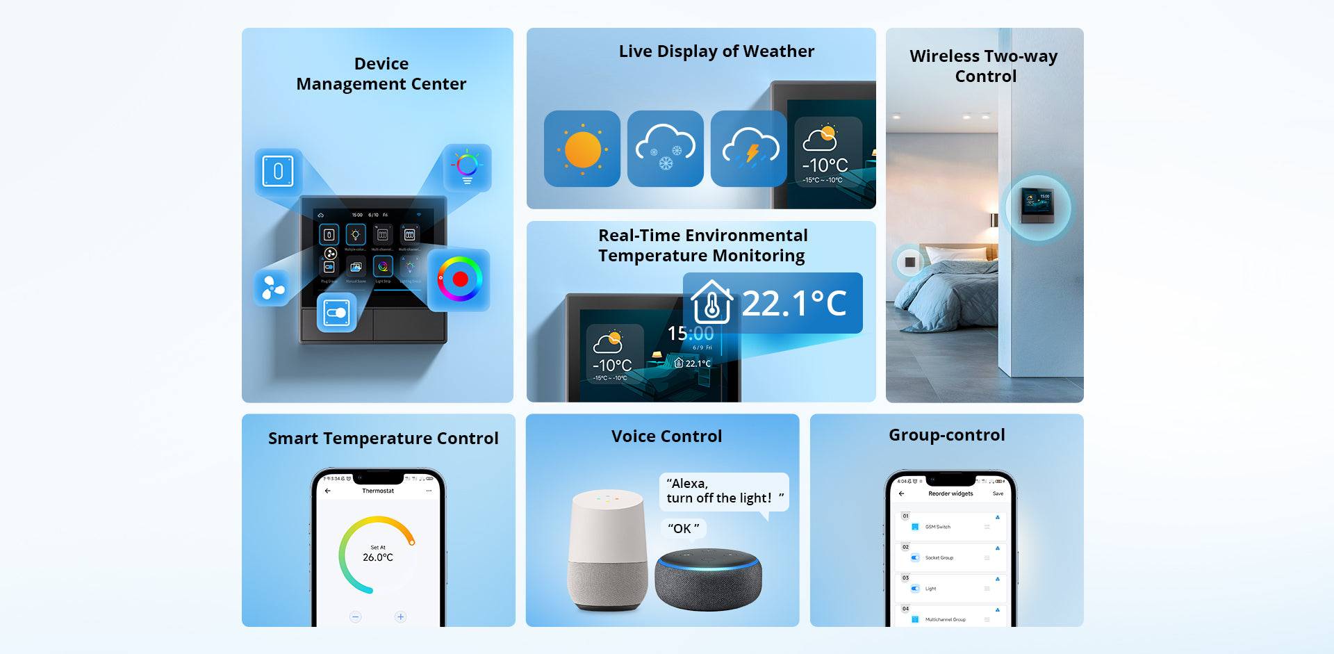【Controllo della Temperatura】Dotato di un termostato intelligente, NSPanel ti consente di programmare le impostazioni della temperatura durante il giorno. Controlla automaticamente i tuoi dispositivi di riscaldamento o raffreddamento per mantenere un clima interno confortevole.