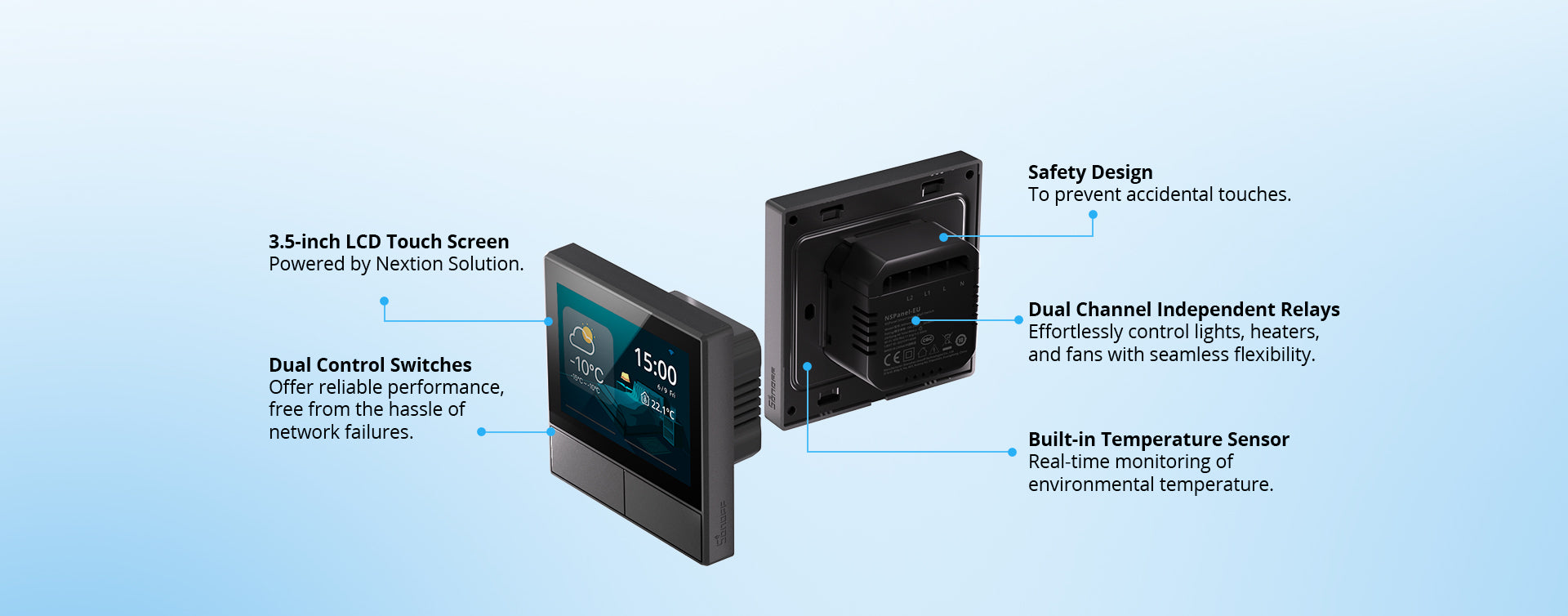 SONOFF NSPanel è un interruttore da parete intelligente tutto-in-uno che combina controllo touchscreen, termostato e interruttore a doppio canale in un'unica interfaccia elegante. Personalizza le scene, gestisci i dispositivi SONOFF e controlla le impostazioni della temperatura con facilità. Visualizza meteo in tempo reale, ora e temperature. Supporta Alexa, Google Assistant e Siri Shortcuts per un controllo vocale senza interruzioni.