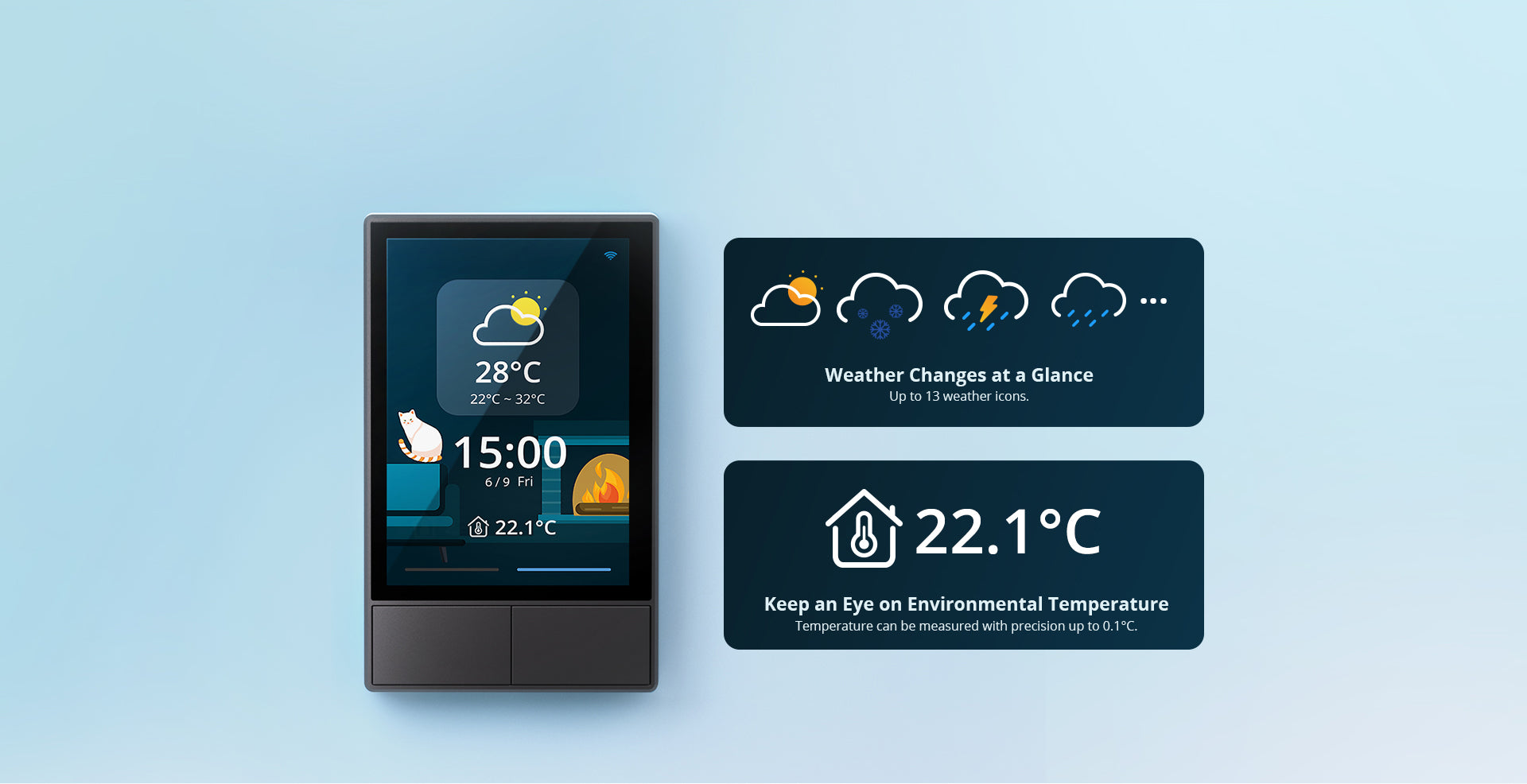 【Visualizzazione di Tempo & Meteo】Con sensori integrati e connettività Wi-Fi, NSPanel visualizza il meteo in tempo reale, le temperature interne/esterne, l'ora e la data—proprio sulla tua parete.