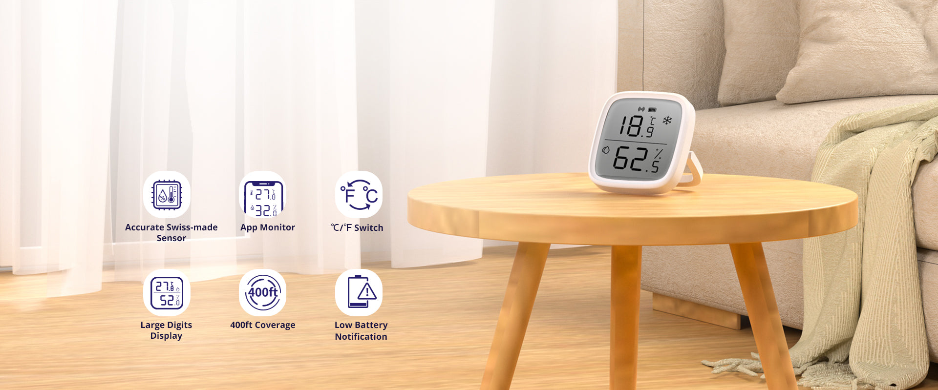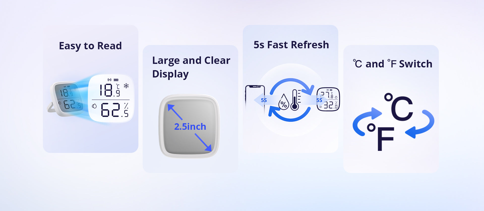 【Alta Precisione & Frequenza di Aggiornamento di 5s】Dotato di un sensore svizzero per misurazioni precise: ±0.2°C / ±0.4°F di precisione sulla temperatura e ±2% RH di precisione sull'umidità. I dati si aggiornano ogni 5 secondi per informazioni tempestive.