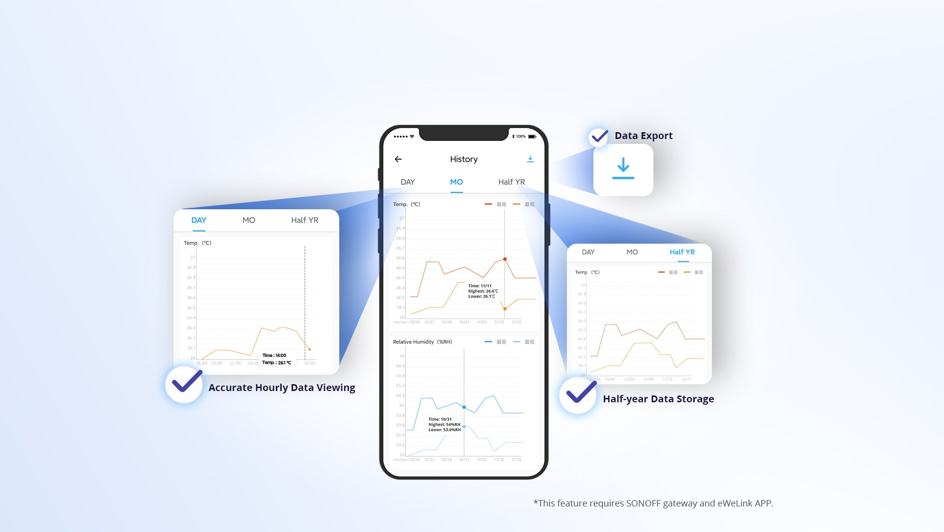 【Registrazione Dati & Esportazione】Include fino a 6 mesi di archiviazione cloud gratuita. Visualizza le tendenze orarie, controlla i massimi e minimi storici ed esporta i dati in formato file per ulteriori analisi.