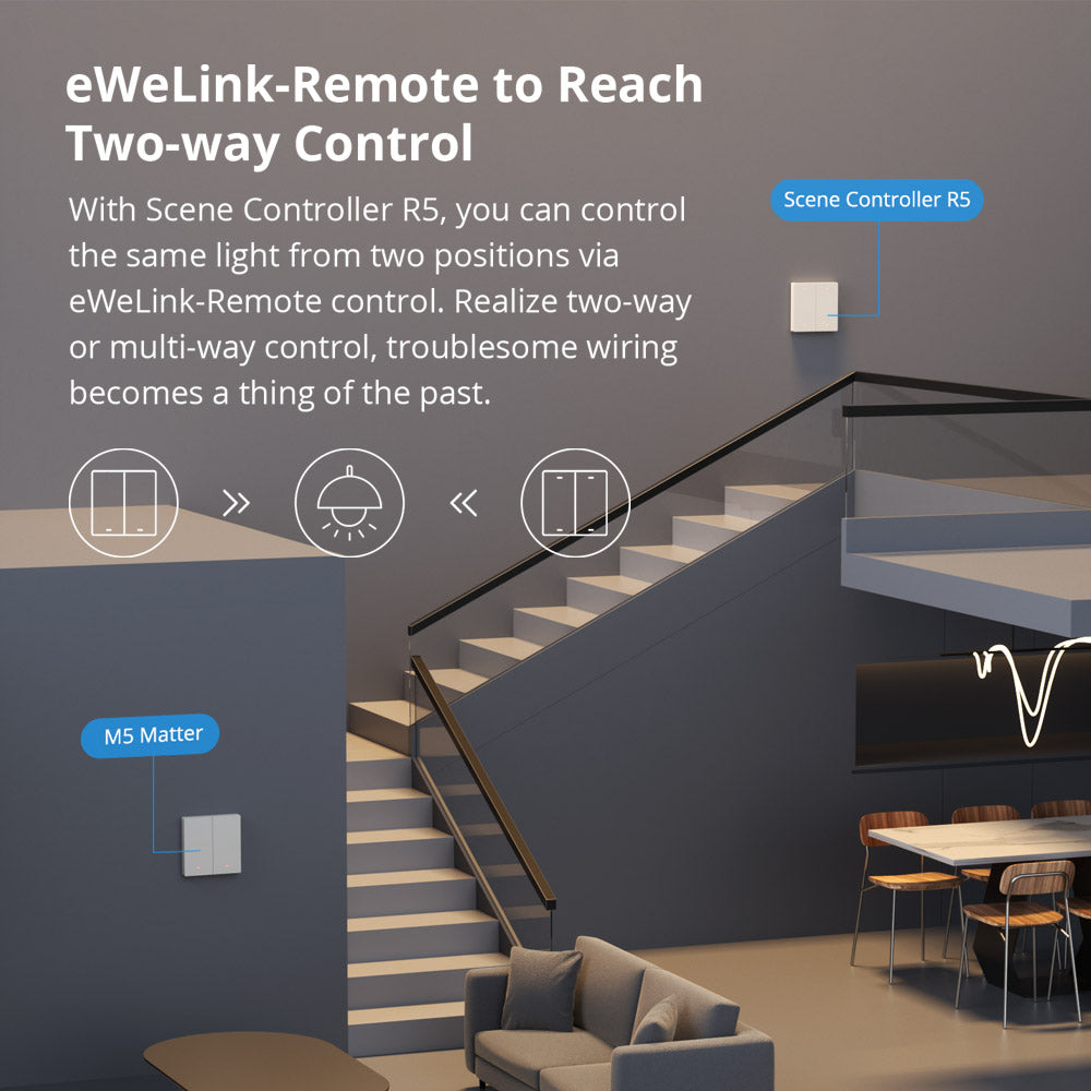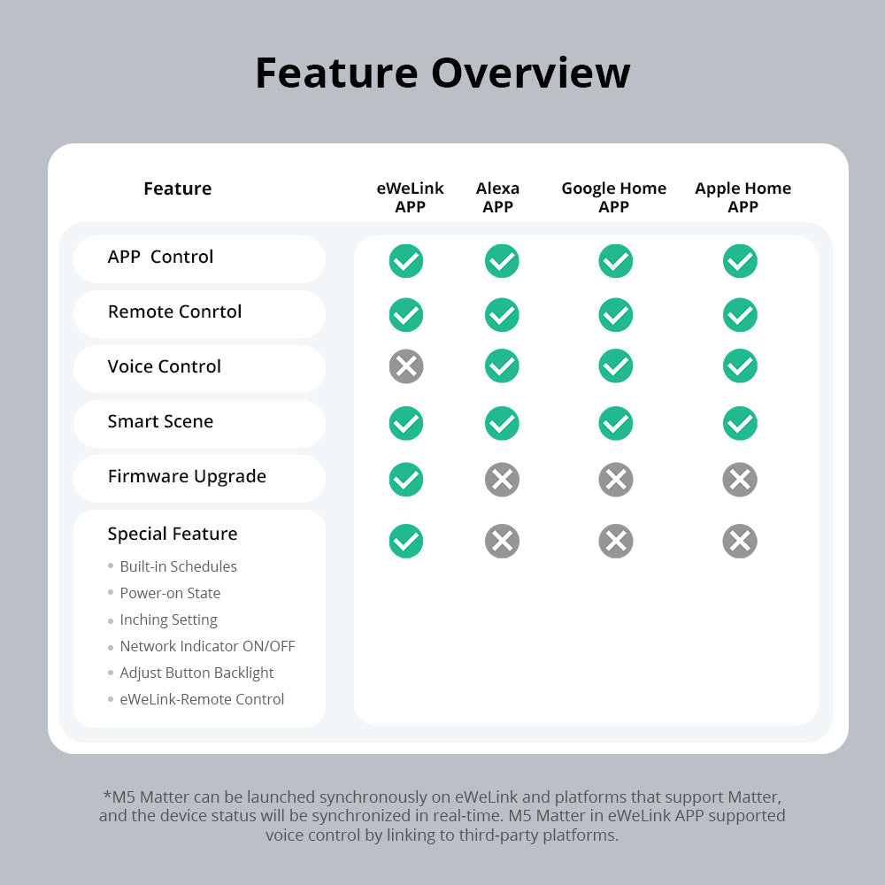 SONOFF M5 Matter Smart Wall Switch offre una compatibilità perfetta con Matter, permettendoti di controllare dispositivi tramite Apple Home, Google Home, Alexa o altri ecosistemi Matter. Automatizza le routine quotidiane con timer, raggruppa più luci per un controllo con un solo tocco e attiva scene intelligenti personalizzate con dispositivi di diversi produttori. Con la condivisione facile dei dispositivi e l'integrazione semplificata tra piattaforme, è l'interruttore smart ideale per uno stile di vita connesso.