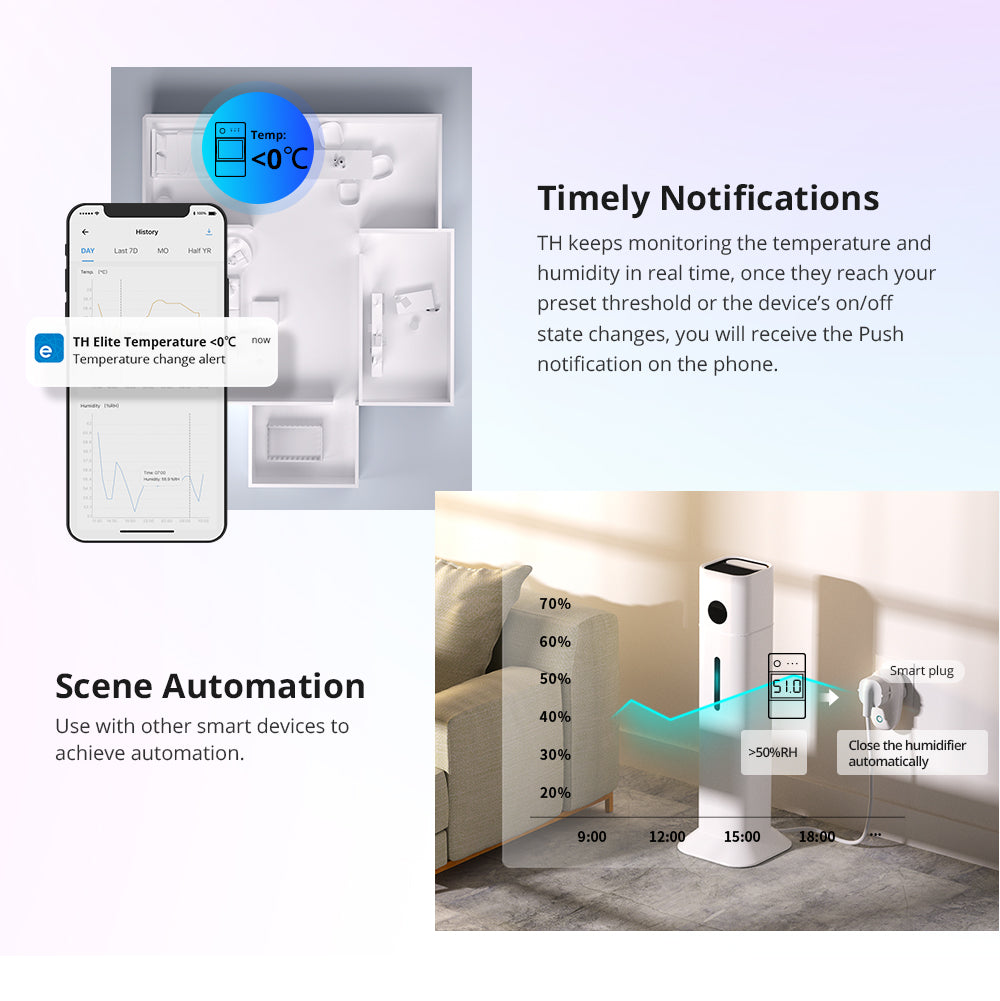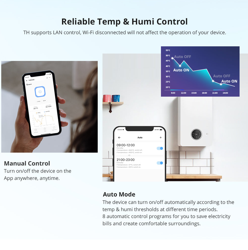 SONOFF TH Elite è un interruttore intelligente per il monitoraggio della temperatura e dell'umidità con un'uscita a contatto secco da 20A, ideale per HVAC, caldaie e sistemi industriali. Dispone di uno schermo LCD chiaro per dati in tempo reale, memorizza la cronologia di 6 mesi con file .xlsx esportabili e supporta fino a 8 programmi intelligenti. Con l'integrazione di Alexa e Google Assistant, offre un'automazione climatica precisa e controllata tramite voce per la tua casa intelligente.