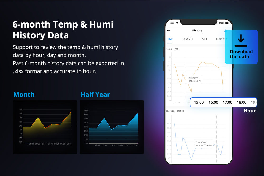 【Storia della Temperatura & Umidità di 6 Mesi – Precisione Oraria, Esportabile】Memorizza i dati di temperatura e umidità per un massimo di 6 mesi, visualizzabili per ora, giorno o mese. I dati possono essere esportati in formato .xlsx per l'analisi del comfort domestico.
