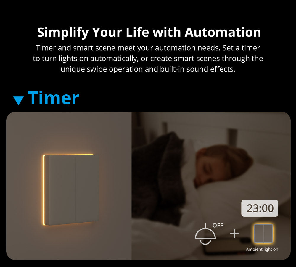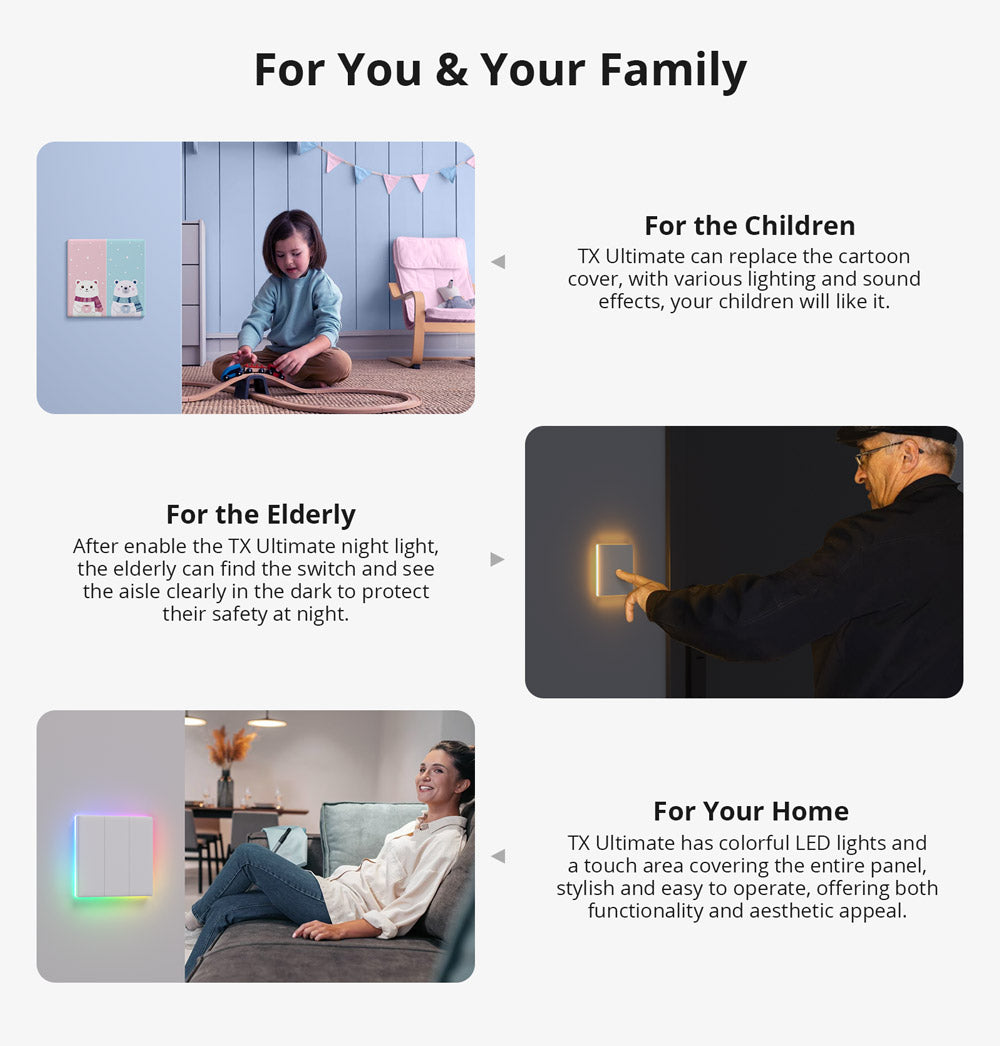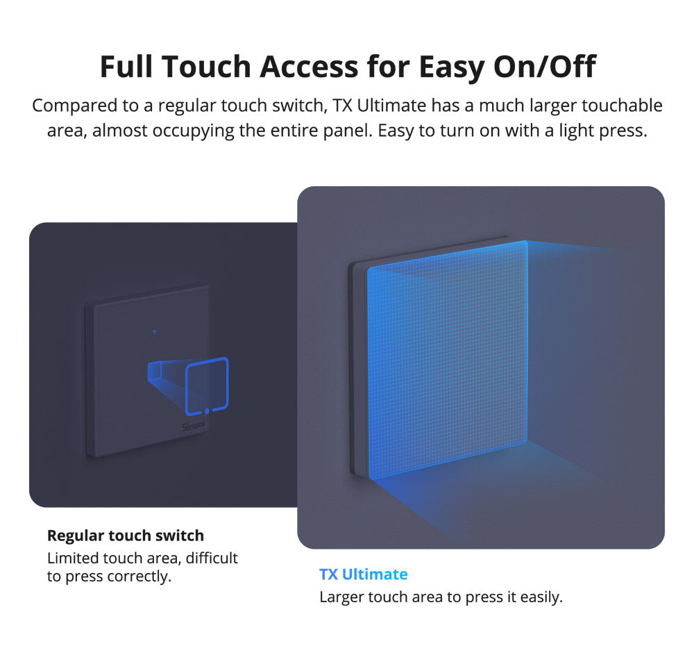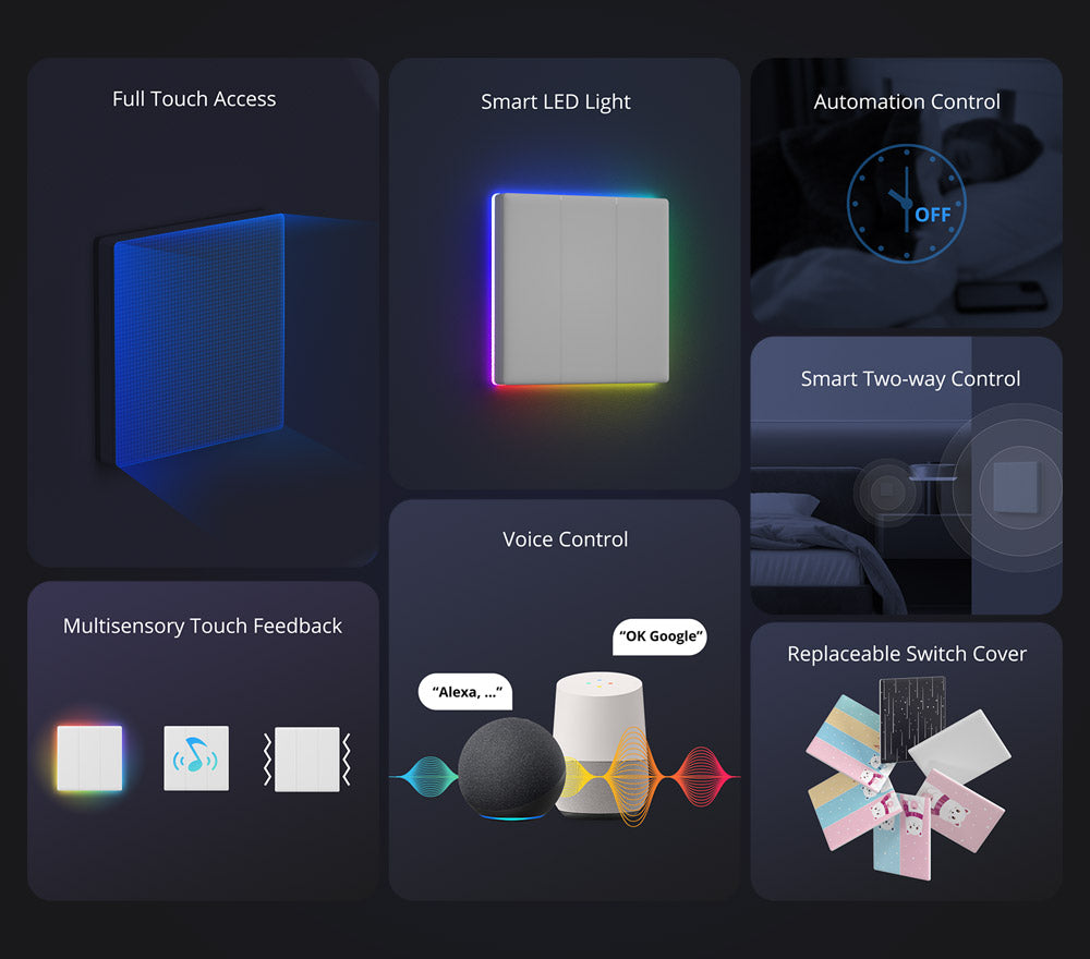 SONOFF TX Ultimate Smart Touch Wall Switch combina controllo avanzato e design elegante con accesso completo al tocco e supporto dual-mode sia per luci che per tende intelligenti. Presenta un cerchio personalizzabile di luci a bordo RGB, feedback multisensoriale con suono e vibrazione, e automazione tramite timer e scene intelligenti, migliorando sia la funzionalità che l'atmosfera. Le sue coperture per interruttori sostituibili e le opzioni di condivisione del dispositivo lo rendono una scelta versatile e pronta per il futuro per gli aggiornamenti della casa intelligente.