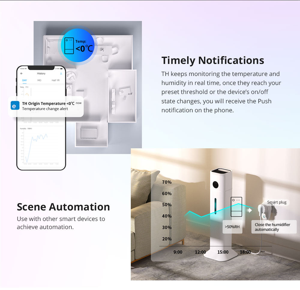 【Smart Scenes & Multi-Device Automation】Easily create smart scenes that trigger actions based on temperature, humidity, or device status (on/off/invert). Use TH Origin as a trigger or an action executor in your broader smart home ecosystem.