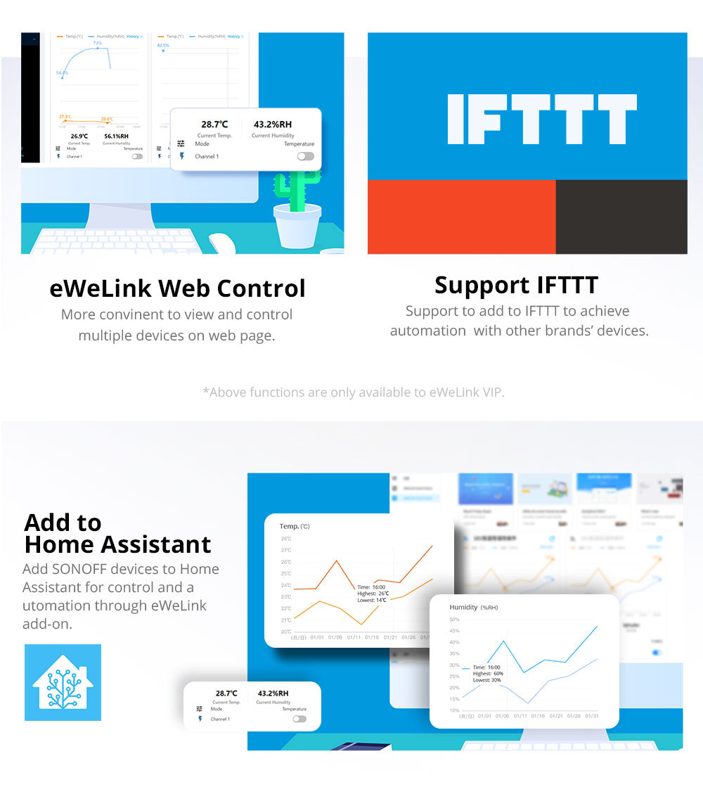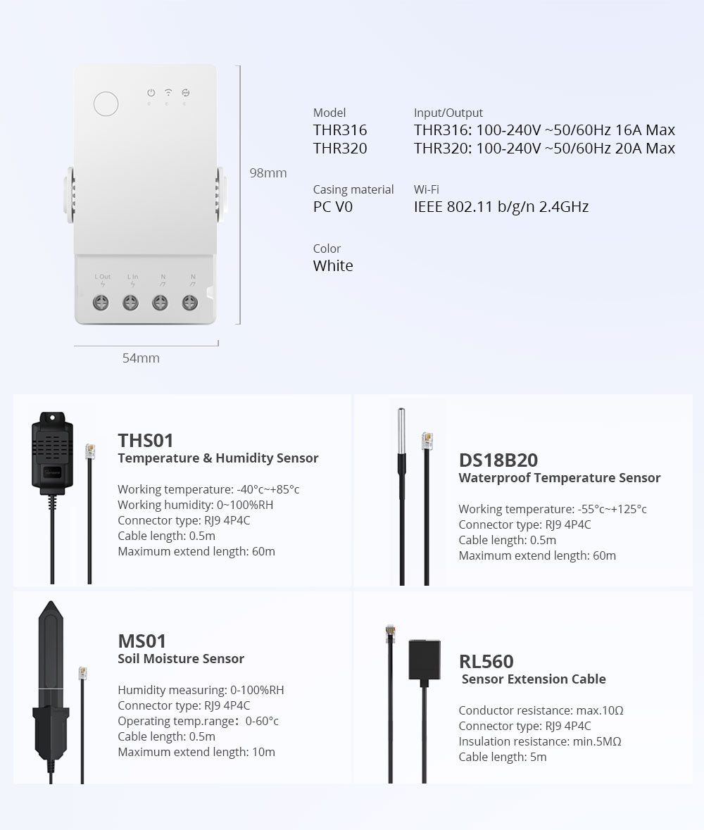 SONOFF TH Origin is a Wi-Fi smart switch with real-time temperature and humidity monitoring. With up to 20A max load, it controls high-power devices like heaters or dehumidifiers. You can view 6-month data by hour in the app, and export to .xlsx for analysis, set up to 8 automation programs based on time, temperature, or humidity to save energy and stay comfortable. It supports 3 types of sensors: THS01 for temperature and humidity, WTS01 for water temperature monitoring, and MS01 for soil moisture, making it ideal for a wide range of applications.