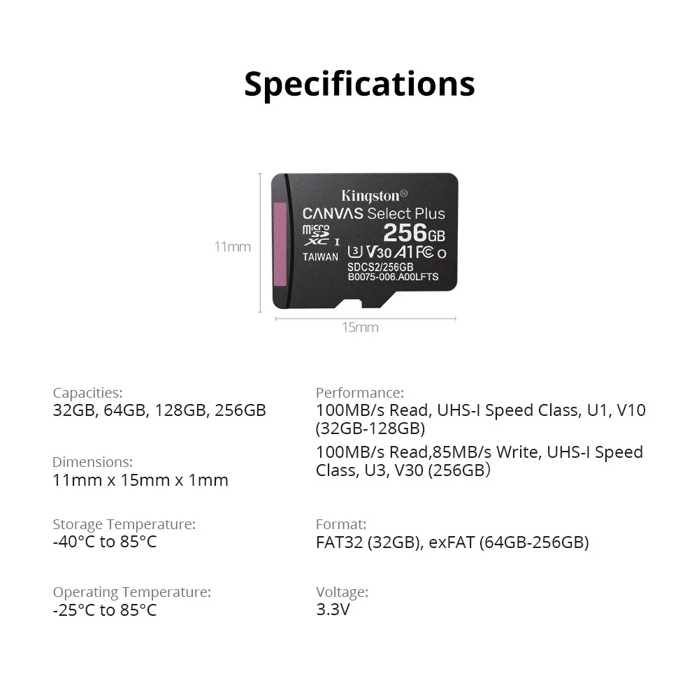 100MB/s Read,85MB/s Write, UHS-I Speed Class, U3, V30 (256GB)