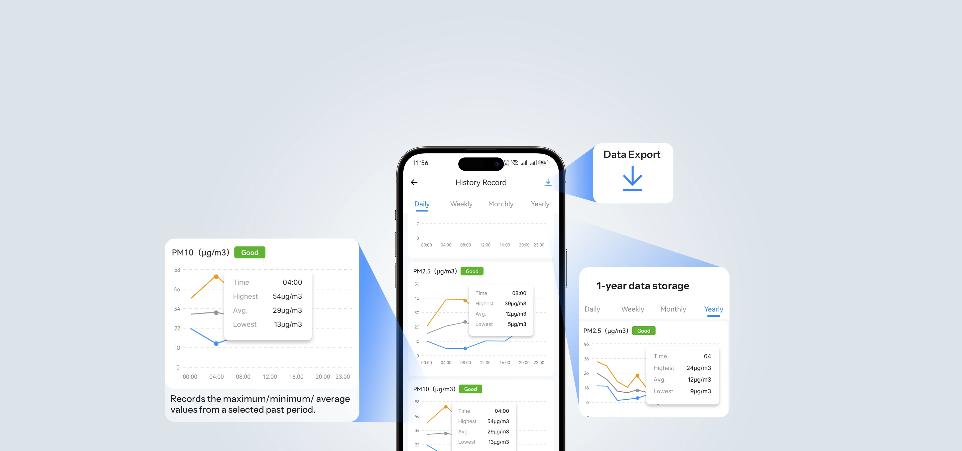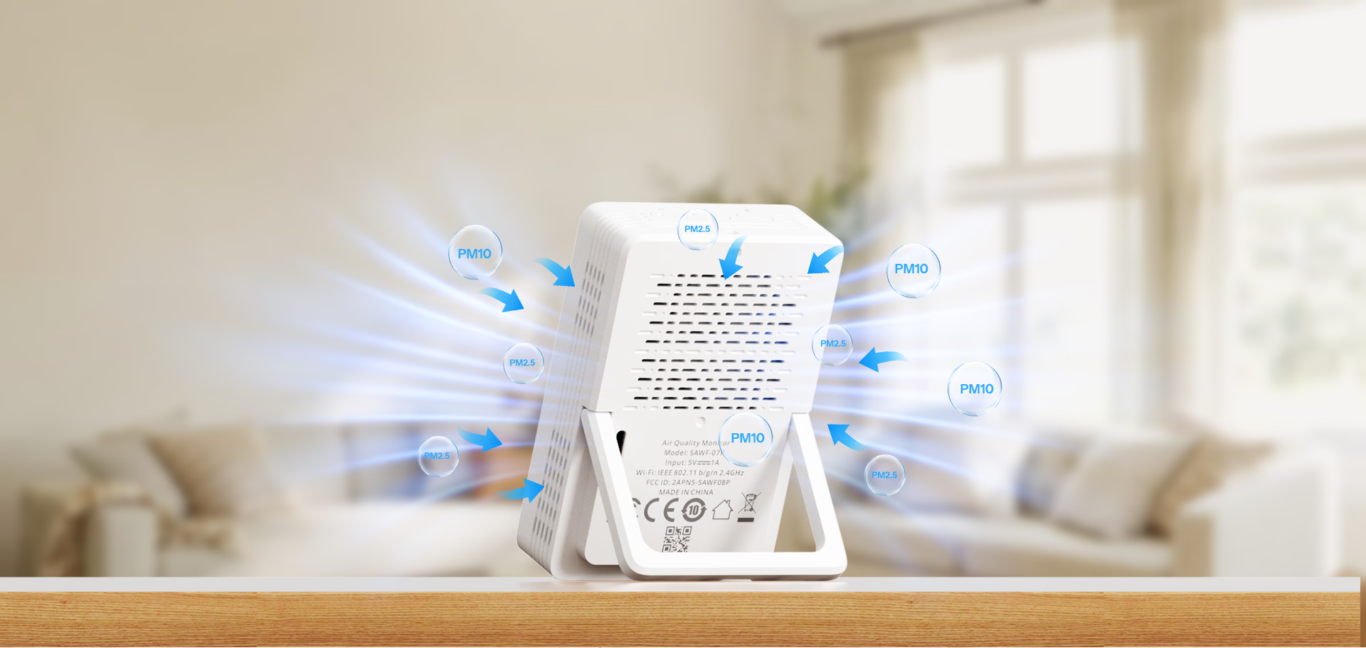 AirGuard PM2.5 is a Matter over Wi-Fi PM2.5/PM10 air quality monitor that connects effortlessly to Apple Home, Amazon Alexa, Google Home, and other major platforms. It delivers high-precision measurements with rapid 2-second updates and tracks multiple key metrics, including temperature, humidity, and PM2.5/PM10 levels. The device offers simple air-improvement suggestions based on both indoor readings and your city's outdoor conditions. A triple alert system—sound alarms, indicator lights, and push notifications—ensures you never miss critical changes. It also stores up to one year of historical data with export support, providing a solid foundation for long-term home air-quality insights.