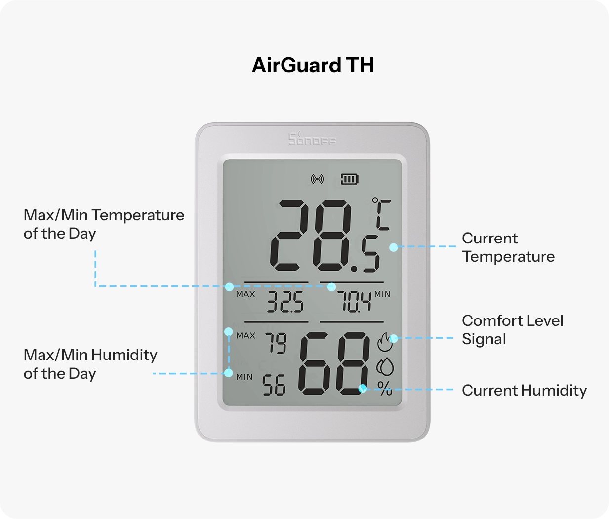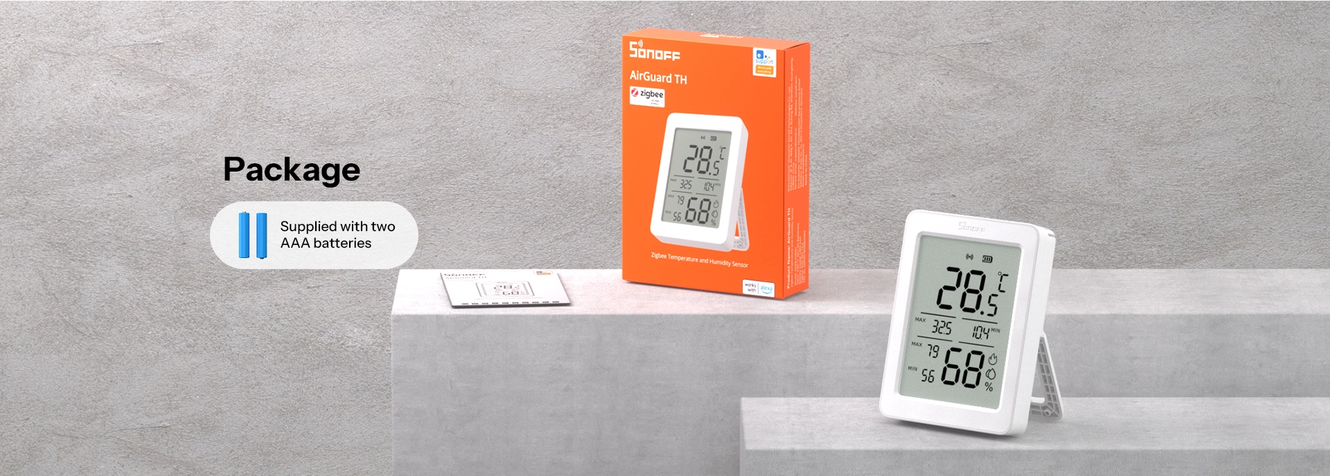 AirGuard TH is a Zigbee LCD temperature and humidity sensor designed for comprehensive indoor climate monitoring. Equipped with a 3.6-inch large display, it shows real-time temperature, humidity, 24-hour extremes, and remote sensor data at a glance. The data can be monitored via App and viewed in multiple curves and charts. In Zigbee mode, it can link with SNZB-02/02P/02WD/02D/02LD devices to instantly display other sensor readings, enabling fast checks without using a phone or entering the room. It calculates dew point and VPD curves for quantitative air quality insights and supports adjustable reporting intervals for tailored data updates. Voice query is avaliable after integrated with Alexa, Google Home and SmartThings, making climate management smarter and more convenient.