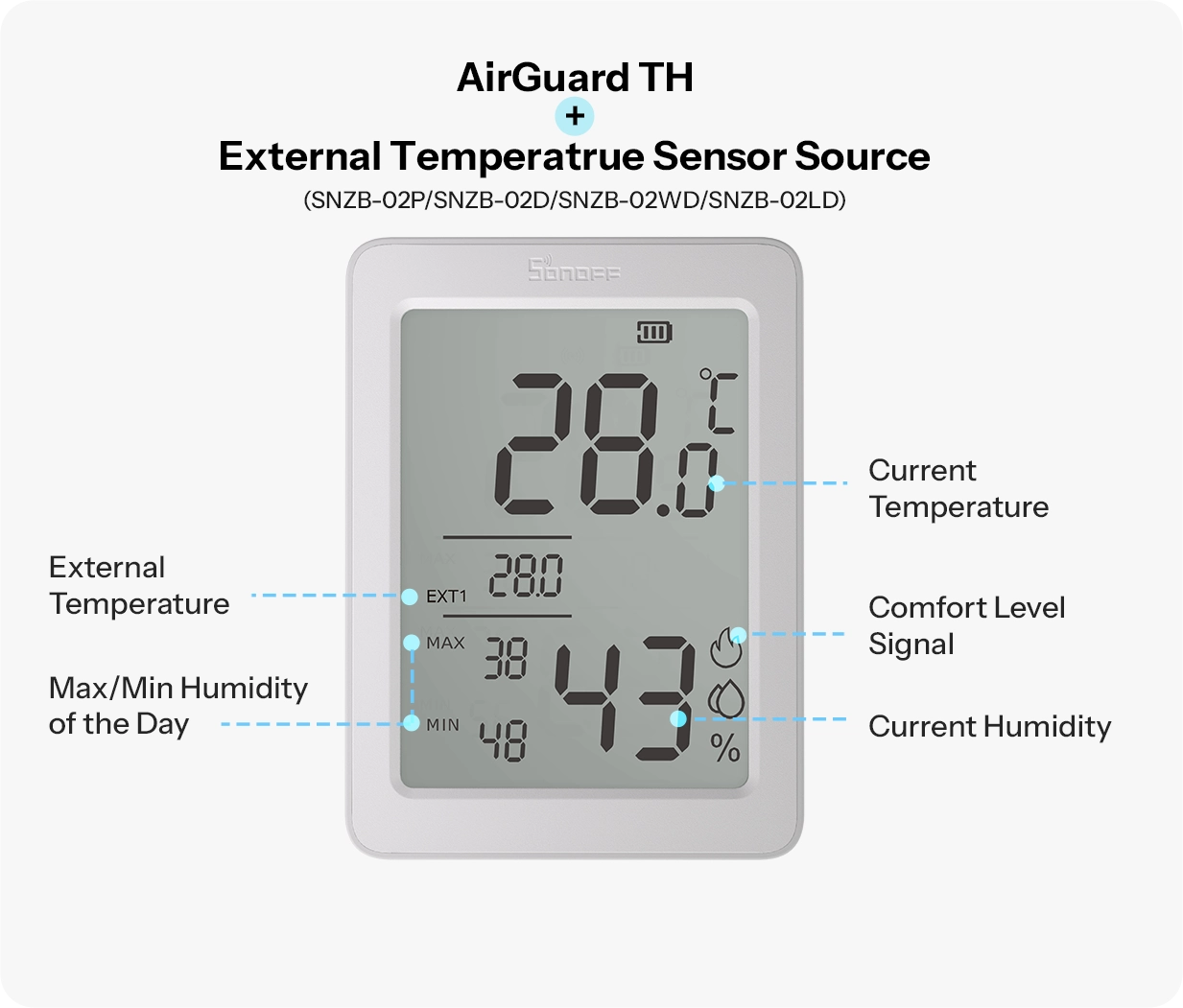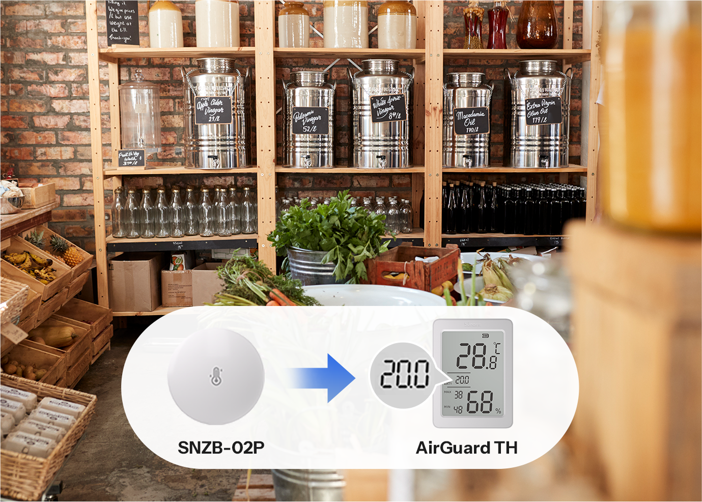 【Remote Temperature Comparison】In Zigbee mode, links with SNZB-02/02P/02WD/02D/02LD devices to instantly display other sensor temperatures, allowing fast checks without opening your phone or entering the room.