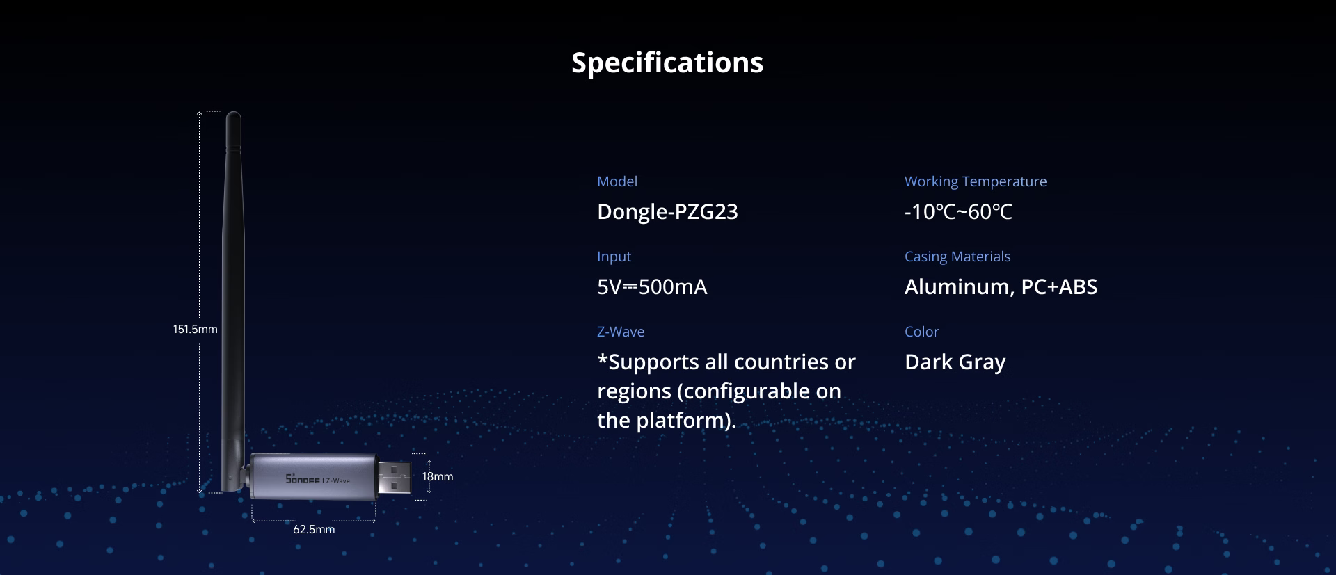 Dongle-PZG23 is a high-performance Z-Wave USB adapter designed for secure, stable, and long-range smart home control. Powered by the advanced Z-Wave 800 Series EFR32ZG23 chip, it supports S2 Security, delivers strong anti-interference performance, and ensures reliable communication with your Z-Wave devices. Featuring a 2 dBi external adjustable antenna and Z-Wave Long Range (ZWLR) technology, Dongle-PZG23 enables connections over 1,000 meters, expanding coverage across large spaces. Preloaded with the latest Z-Wave firmware, it offers true plug-and-play setup via USB. Compatible with popular open-source platforms such as Home Assistant and openHAB, and equipped with a USB extension for flexible placement, Dongle-PZG23 is a powerful and dependable solution for building a robust Z-Wave network.