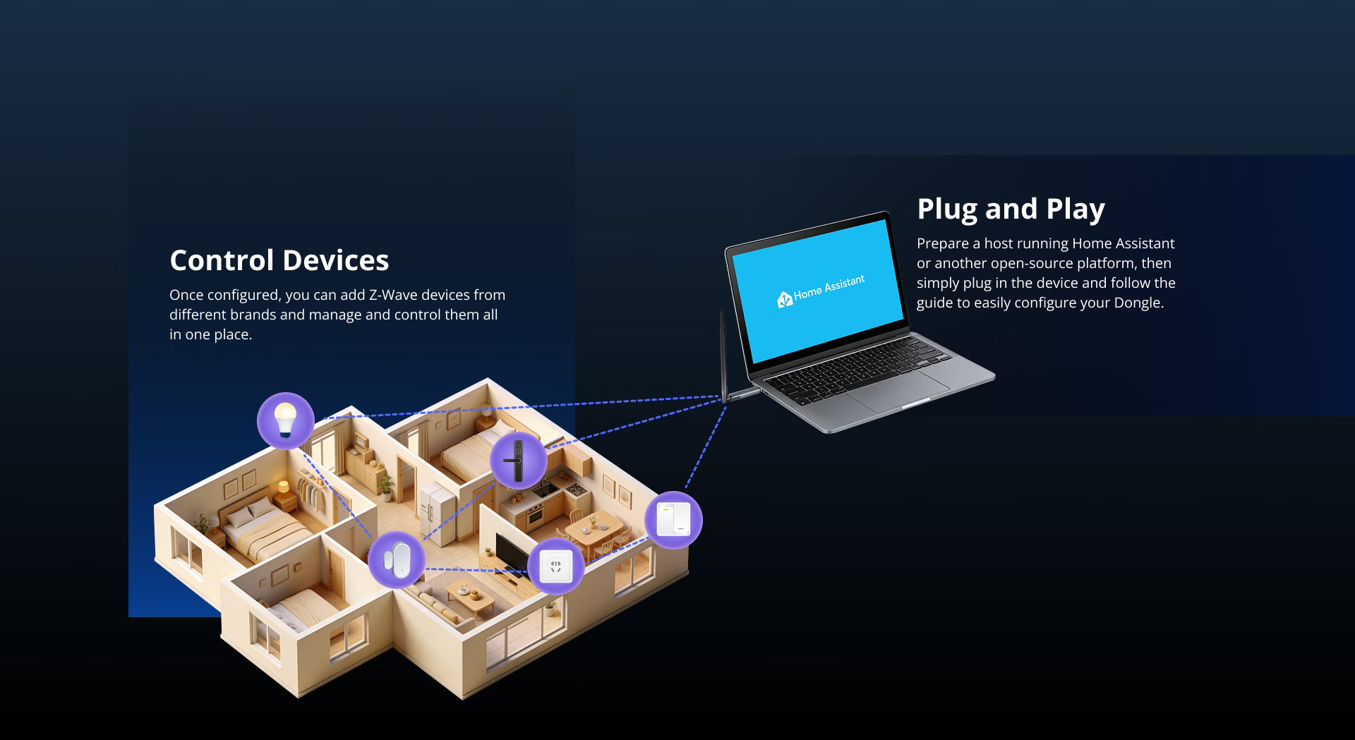 The Z-Wave 800 Dongle Plus supports Z-Wave Long Range (ZWLR), extending your control beyond the home. Whether it's garage doors, outdoor patios, or devices in signal-weak areas like basements, it provides stable point-to-point control, keeping distant devices always within reach.