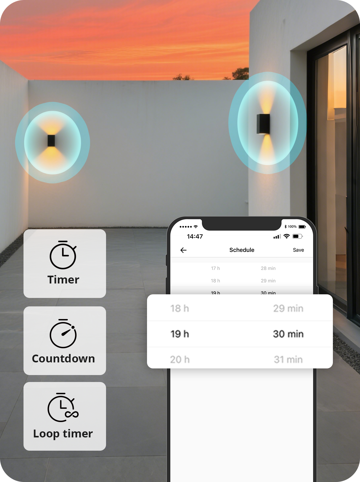 Setting a smart timer to open your backyard lights when sunset.